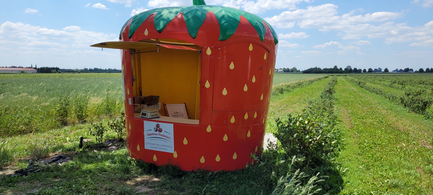 Duża truskawka przy głównej drodze informuje gdzie trzeba się zgłosić do samozbioru (fot. M. Matejuk)