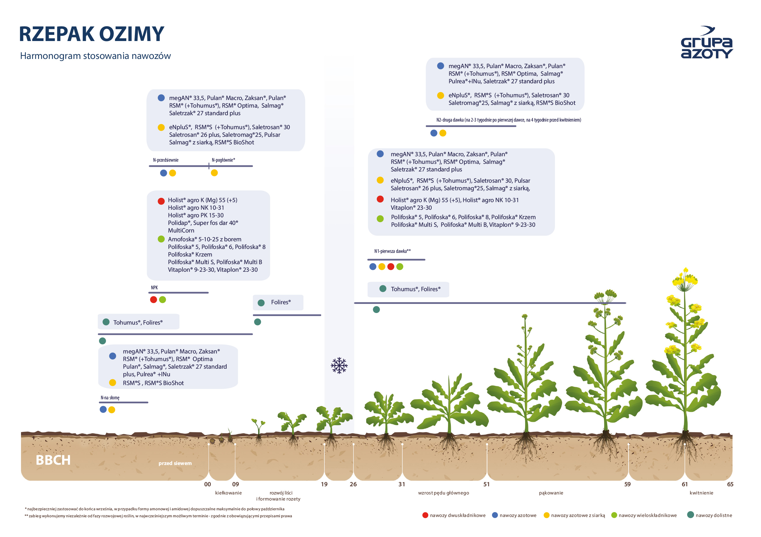 Rzepak do wytworzenia 1 tony nasion i odpowiedniej ilości słomy potrzebuje średnio: 50 kg azotu (N), 25 kg fosforu (P2O5), 50-60 kg potasu (K2O), 50-60 kg wapnia (CaO), 8-10 kg magnezu (MgO), 37,5 kg siarki (SO3), a także 60 g boru (B), 10-40 g miedzi (Cu), 100 g manganu (Mn), 1-2 g molibdenu (Mo) i 60-150 g cynku (Zn).