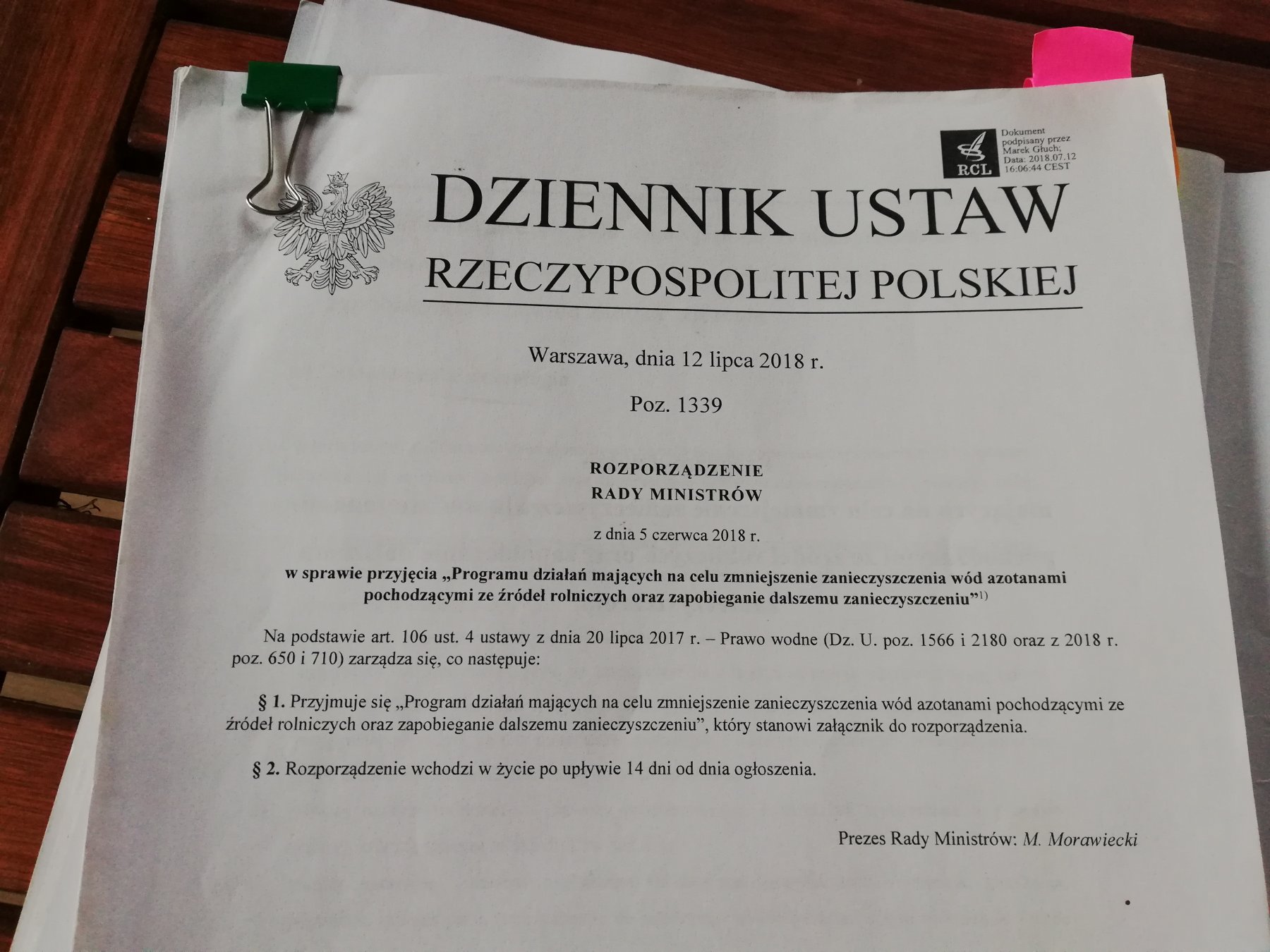 Rozporządzeniem z dnia 5 czerwca 2018 r.(Dz.U. z dnia 12 lipca 2018r. poz. 1339) został wprowadzony Program działań mających na celu zmniejszenie zanieczyszczenia wód azotanami pochodzącymi ze źródeł rolniczych raz zapobieganie dalszemu zanieczyszczaniu.