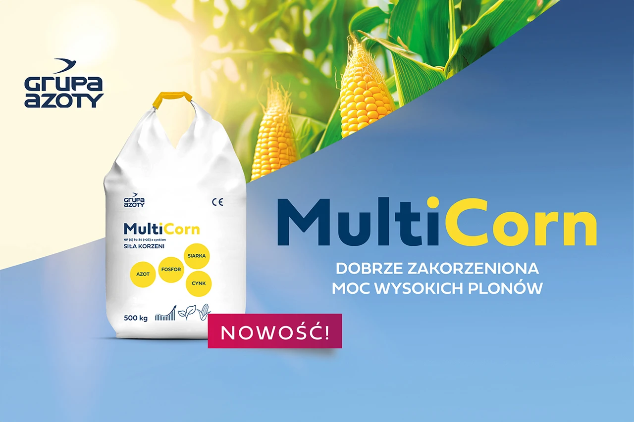 Nowy nawóz MultiCorn od Grupy Azoty Police to odpowiedź na potrzeby rolników poszukujących wydajnych i ekonomicznych rozwiązań nawozowych. Wysoka zawartość łatwo dostępnego fosforu (34%) i azotu (14%), wsparta siarką (23%) oraz dodatkiem cynku, wspomaga rozwój roślin już od momentu siewu. Pobieranie fosforu przez rośliny wspomaga azot w formie amonowej.