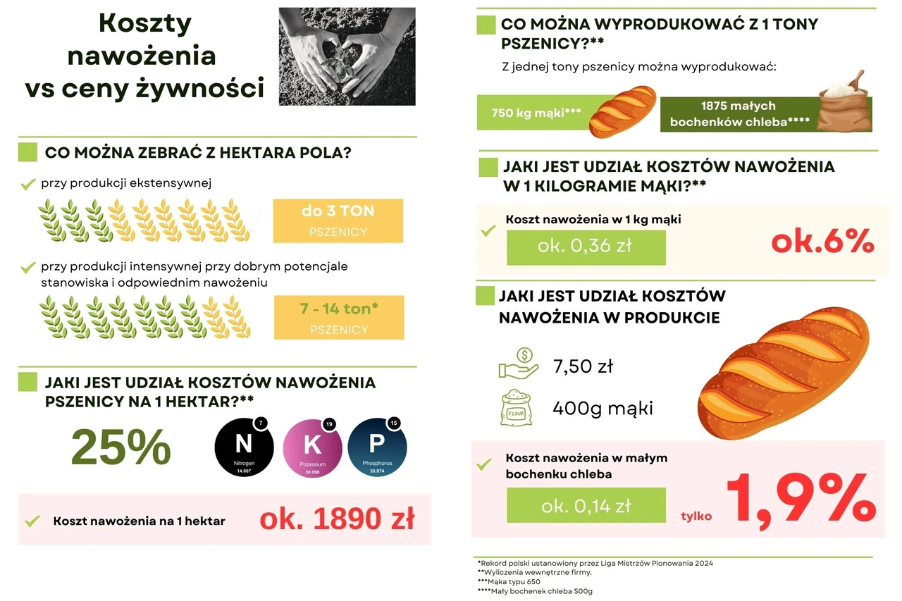 Jednym z kluczowych czynników decydujących o plonowaniu i jakości pszenicy jest odpowiednie nawożenie, zwłaszcza azotowe. Choć nawozy stanowią istotny element kosztów produkcji rolnej, ich wpływ na końcowe ceny żywności często jest przeceniany. Koszt nawozów odpowiada za 20-25% kosztów produkcji jednej tony pszenicy, ale w cenie kilograma mąki udział ten spada do około 6%, a w cenie chleba jest niższy niż 2%.